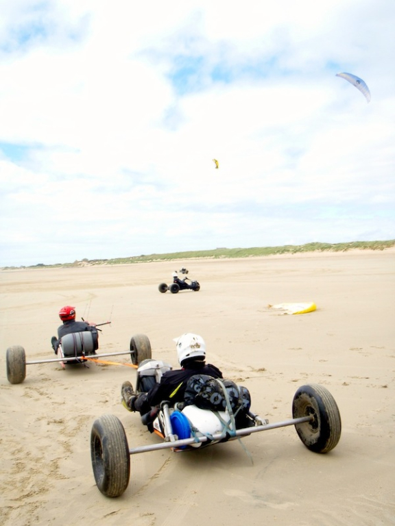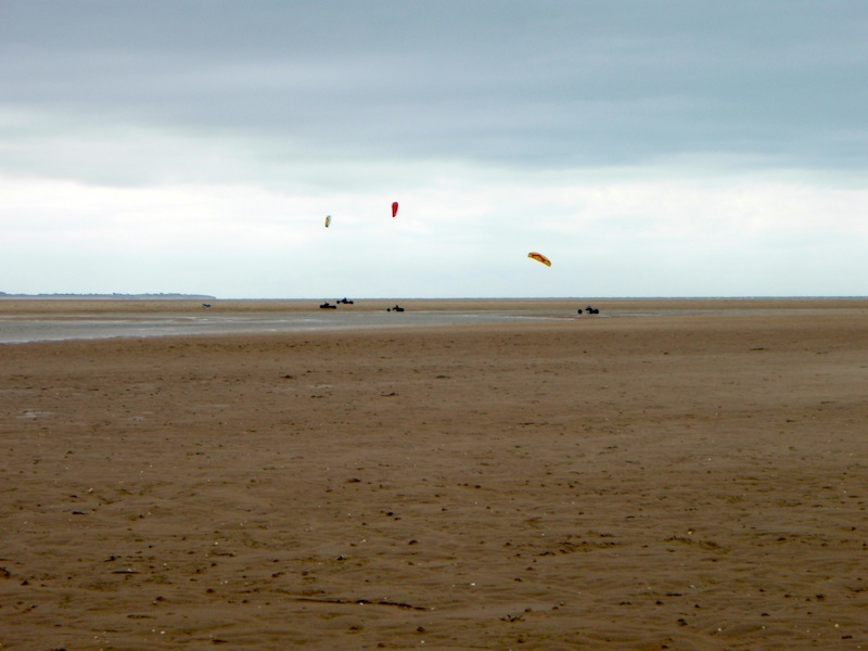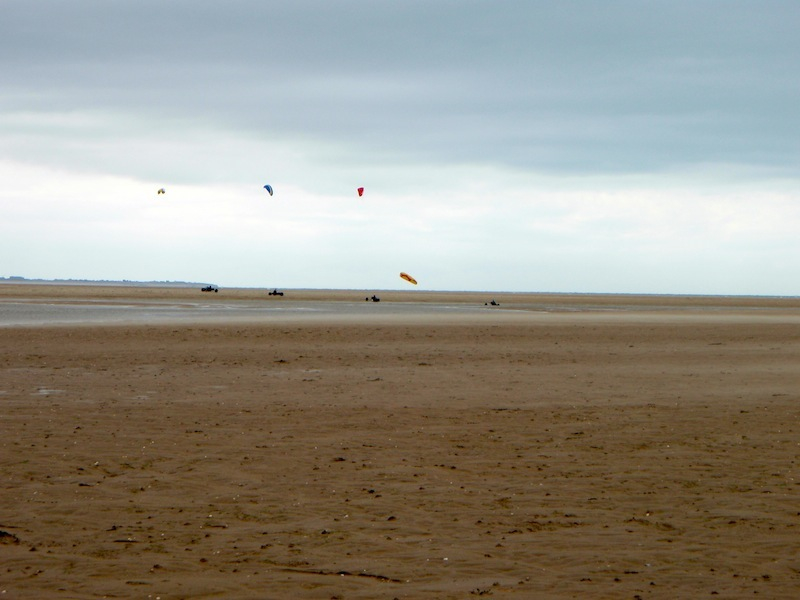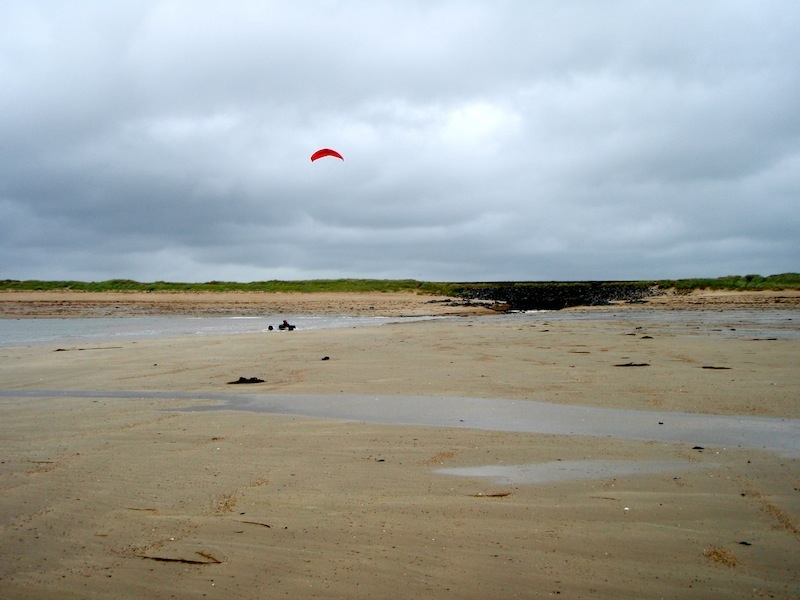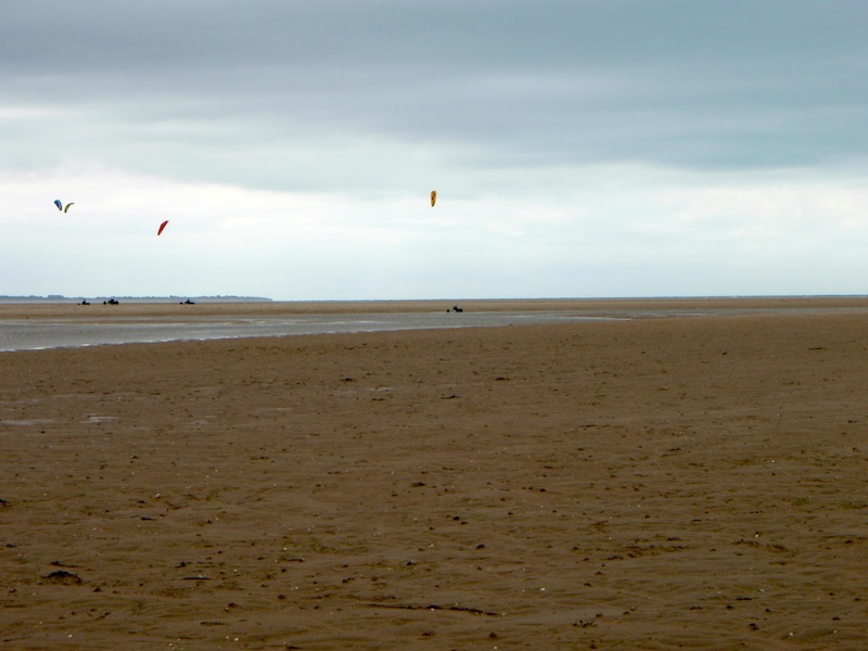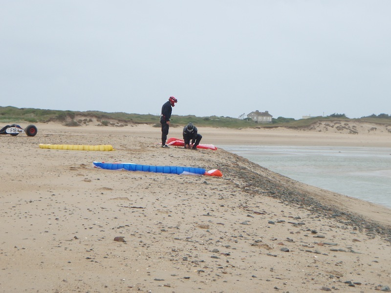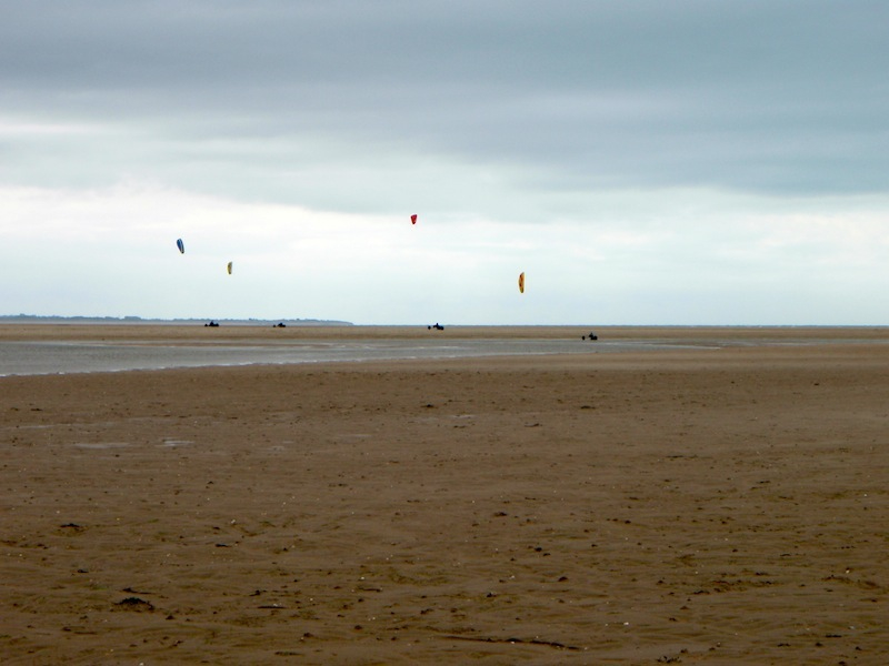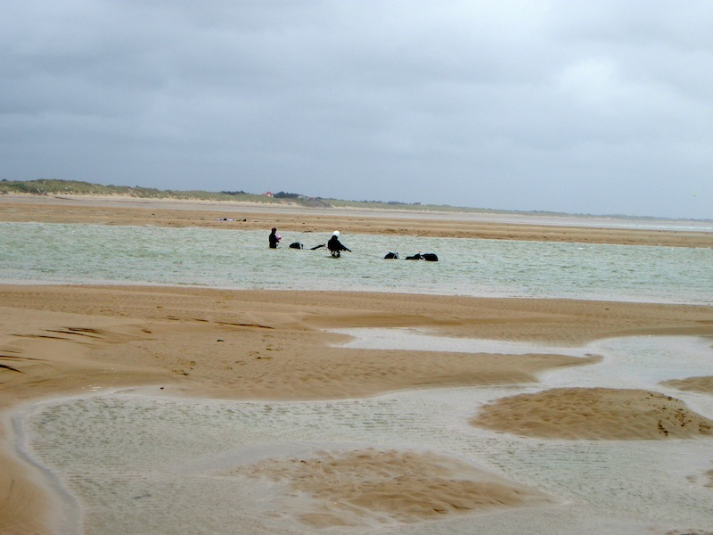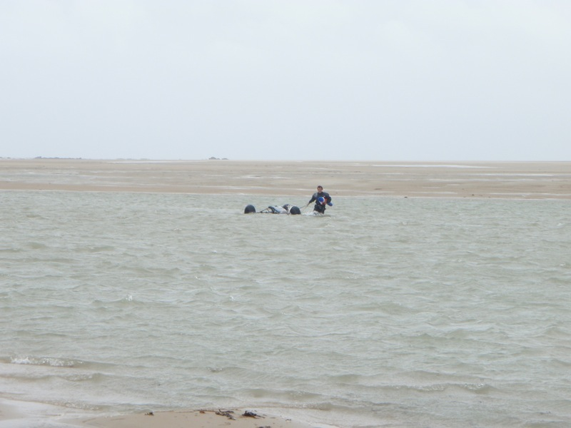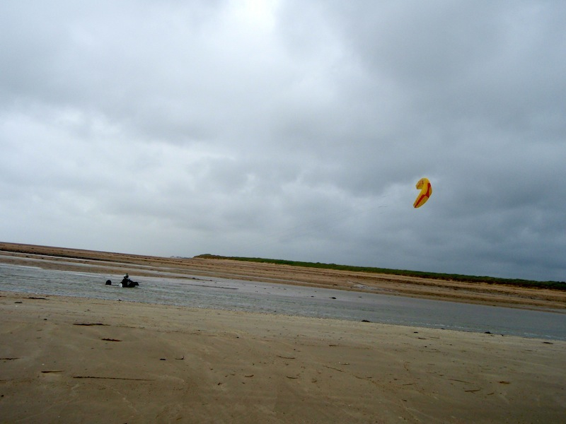 Tout se passe bien, on arrive au havre de Créances et là, la mer est encore très haute…+ d’un mètre, je décide de faire le tour de la rivière pour essayer de trouver un passage plus bas… je galère pendant 20 mn dans des trous d’obus sans pouvoir passer et au moment ou je décide de retourner avec les autres, Bing mes lignes cassent… je change et dans un vent de 50 km/h, c’est pas évident…Prêt à repartir, je fais 30m et Re-Bing, lignes encore cassées… GGrrrr bon c’est compréhensible, elles ont déjà 3 ans et ont beaucoup servie… Je rechange de ligne, je prend celles de Matt, je suis sûr de ne pas avoir de problème, presque neuves…