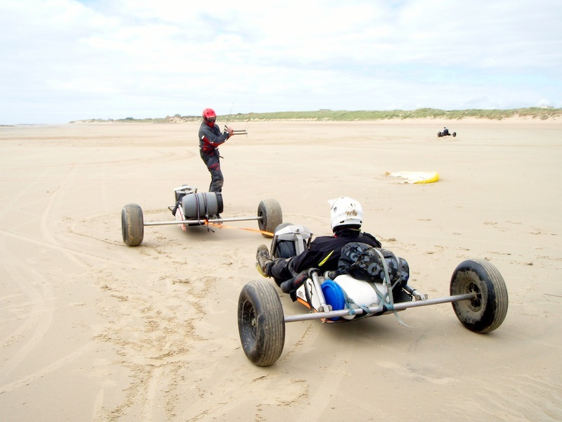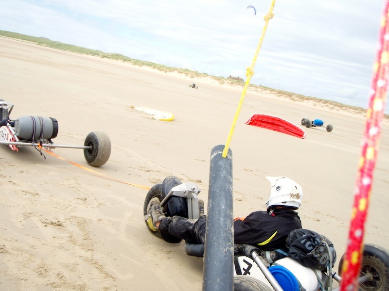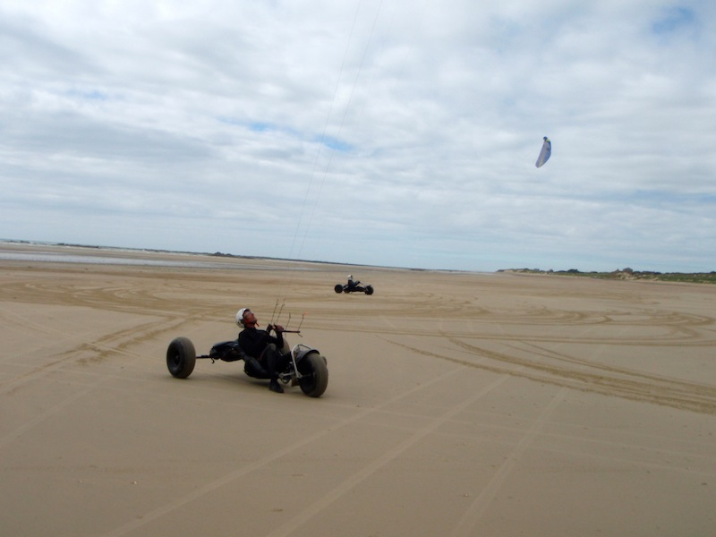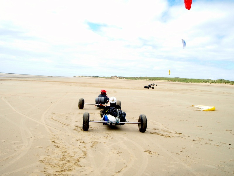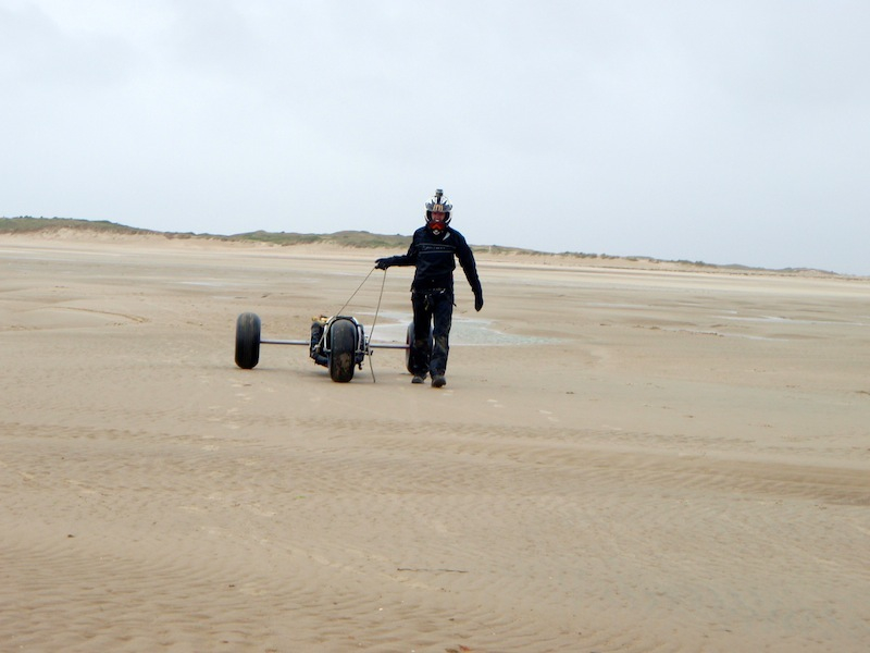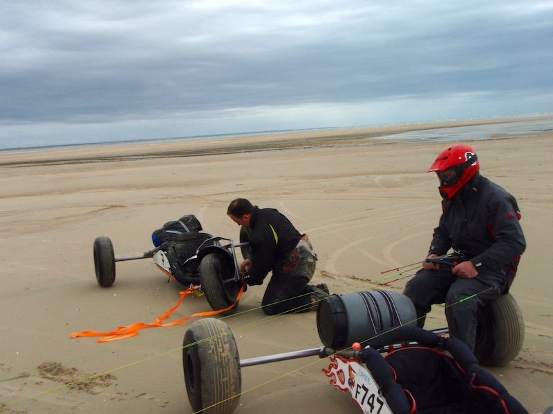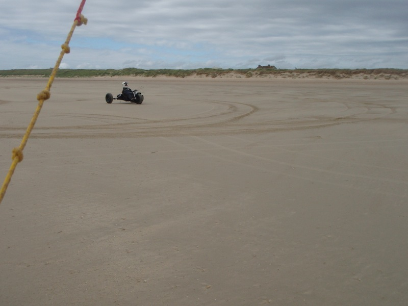 Arrivés à Denneville, je pique une pointe car le vent est toujours aussi fort, je dépasse les 80 km/h et arrivé au bout de la plage, je lance un méchant dérapage controlé à droite pour ralentir… Malheureusement, en dérapant, j’ai roulé dans un trou qui n’était pas rond mais légèrement carré avec un bord bien droit… Le Gorax-Racer n’a pas du tout aimé, j’ai carrément arraché la roue gauche de l’essieu avec le filetage !!!