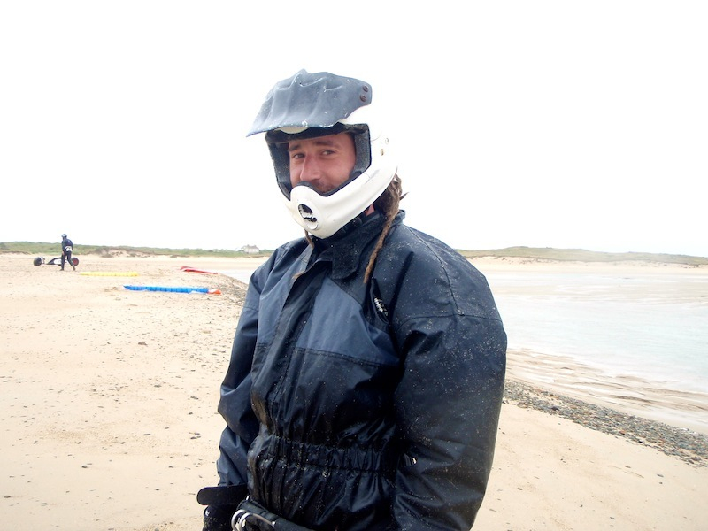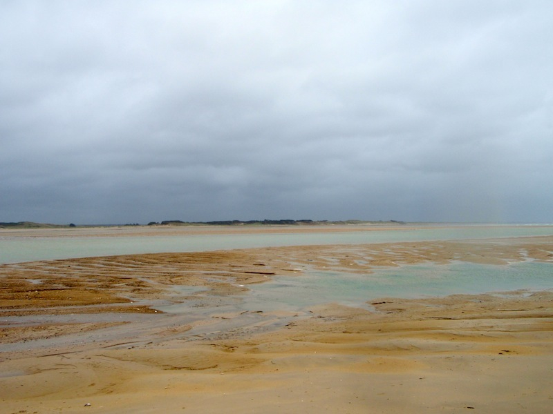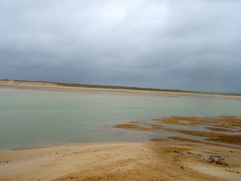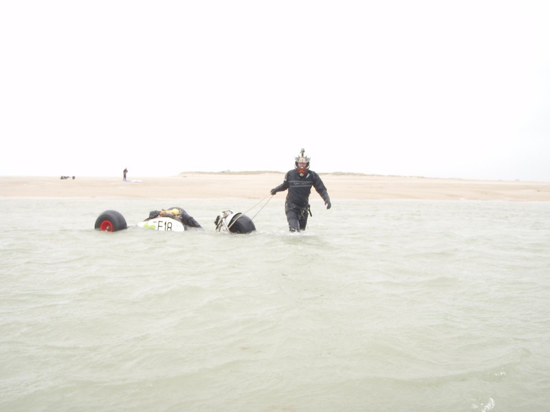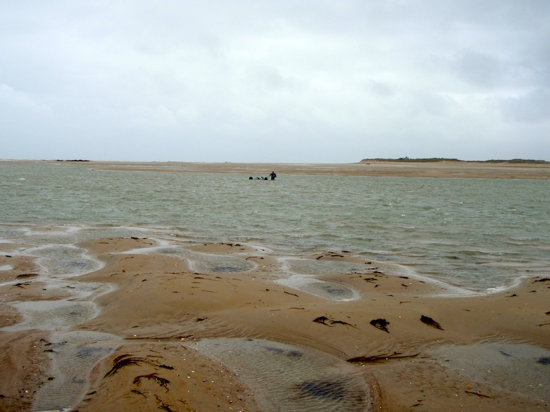 Je suis enfin prêt à repartir, je suis en plein milieu du havre et là, un très gros grain arrive, l’eau et le sable se colle sur mes lunettes et je n’y voit plus rien du tout, obligé de les enlever… Mais le grain est tellement dense que je ne vois plus ma voile ni rien autour de moi, comme un épais brouillard, je ne sais plus où sont les autres… j’avance 50 mètres et je vois mes anciennes traces sur le sable, pas bon, je fais demi tour et continue à rouler tout droit en attendant que le grain passe…