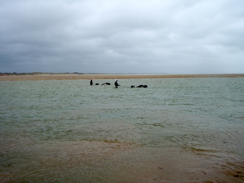 On traverse Créances à pieds, 1.10m d’eau avec du courant et des rochers pas loin, alors on assure…