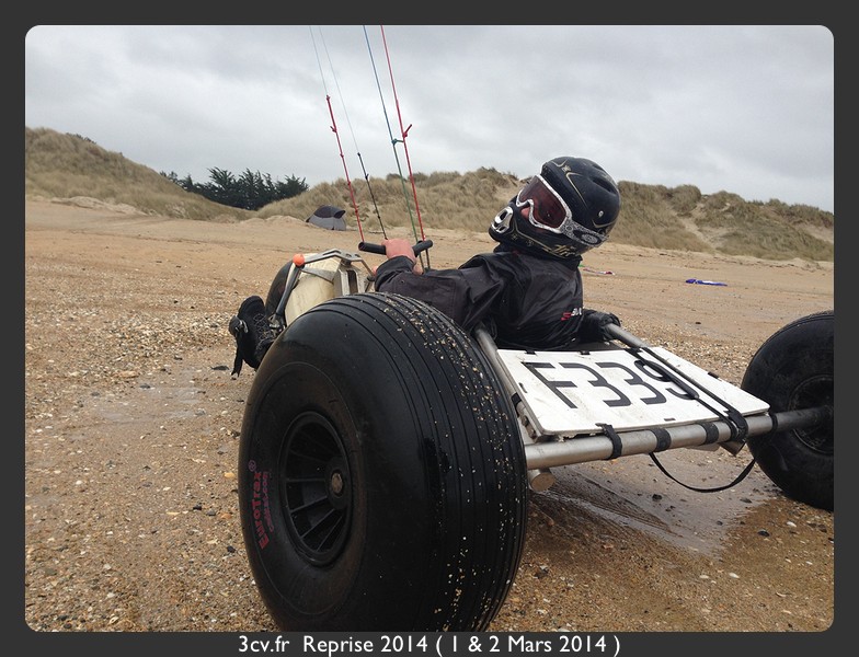 Quand il re-part ma voile prend le vent sur une rafale, la puissance est telle, qu’elle retourne mon char avec moi dessus. Je me retrouve à faire un soleil et finis ma course la tete dans le sable et l’essieu me retombe sur la nuque. Je casse une ligne (je ne sais pas comment) dans la manoeuvre.